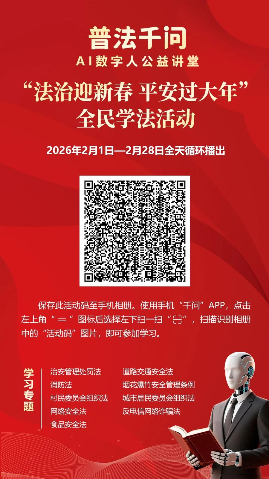 2026年春节将至,为深入贯彻习近平法治思想和《中华人民共和国法治宣传教育法》,努力营造和谐安定的社会环境,确保人民群众度过一个安定祥和的春节,枣庄市普法办公室联合中国民主法制出版社《法治时代》杂志,在2026年春节期间开展“普法千问”AI数字人公益讲堂暨“法治迎新春 平安过大年”全民学法活动。
