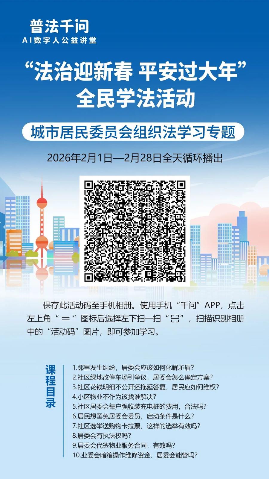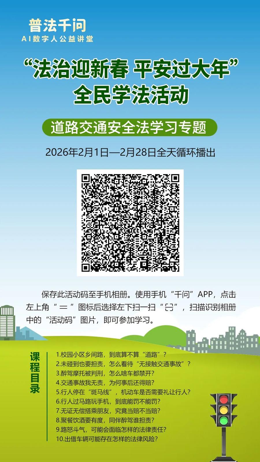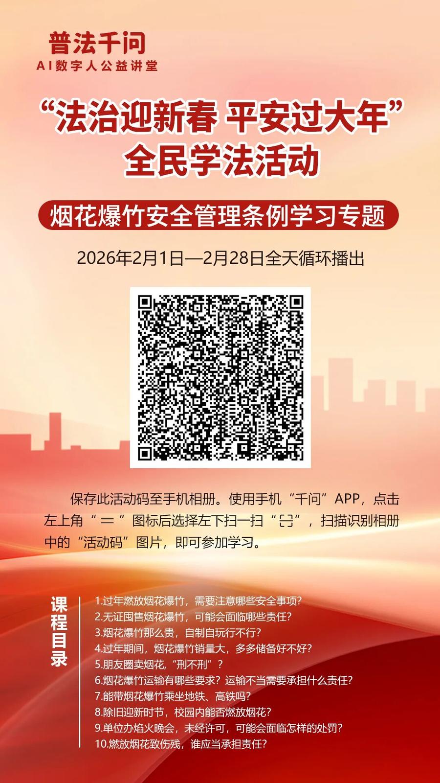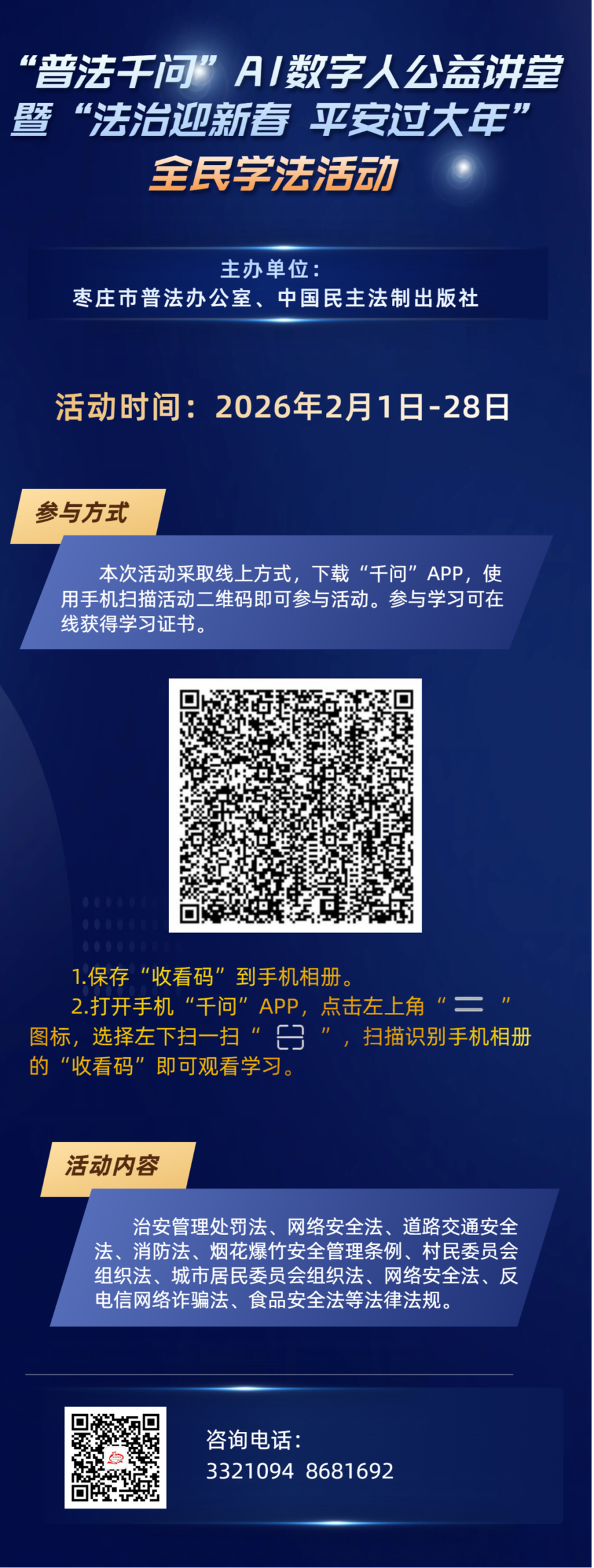 2026年春节将至,为深入贯彻习近平法治思想和《中华人民共和国法治宣传教育法》,努力营造和谐安定的社会环境,确保人民群众度过一个安定祥和的春节,枣庄市普法办公室联合中国民主法制出版社《法治时代》杂志,在2026年春节期间开展“普法千问”AI数字人公益讲堂暨“法治迎新春 平安过大年”全民学法活动。