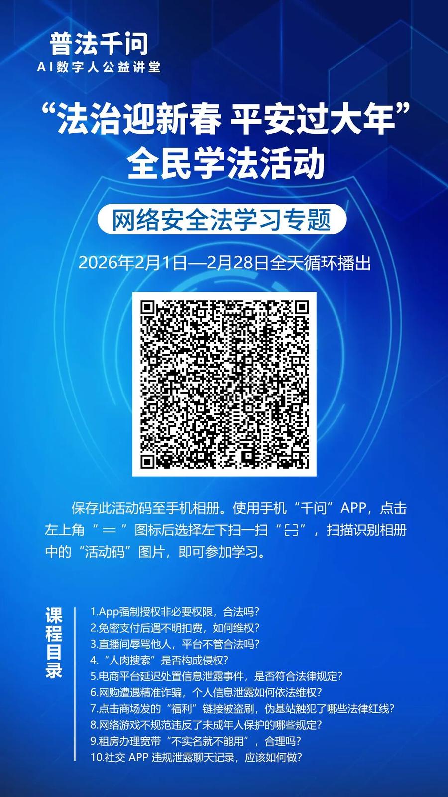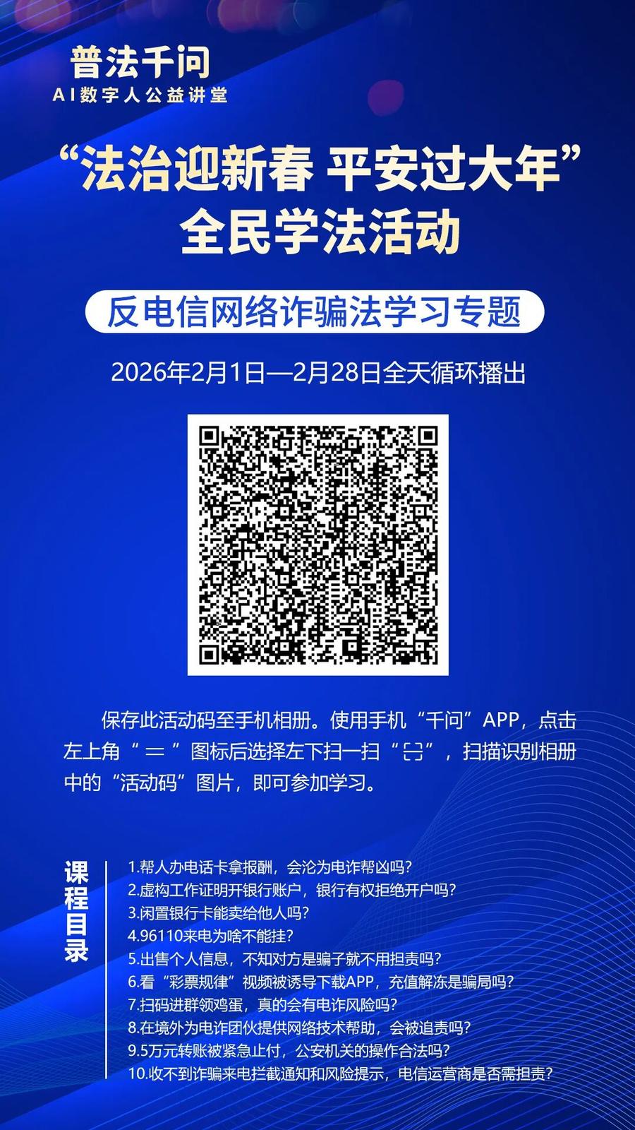 “普法千问”AI数字人公益讲堂暨“法治迎新春 平安过大年”全民学法活动2月1日开启